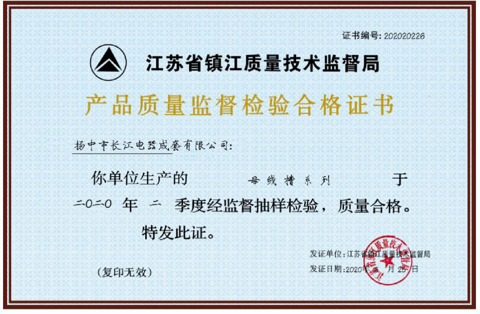 母線槽產品質量監督檢驗合格證書