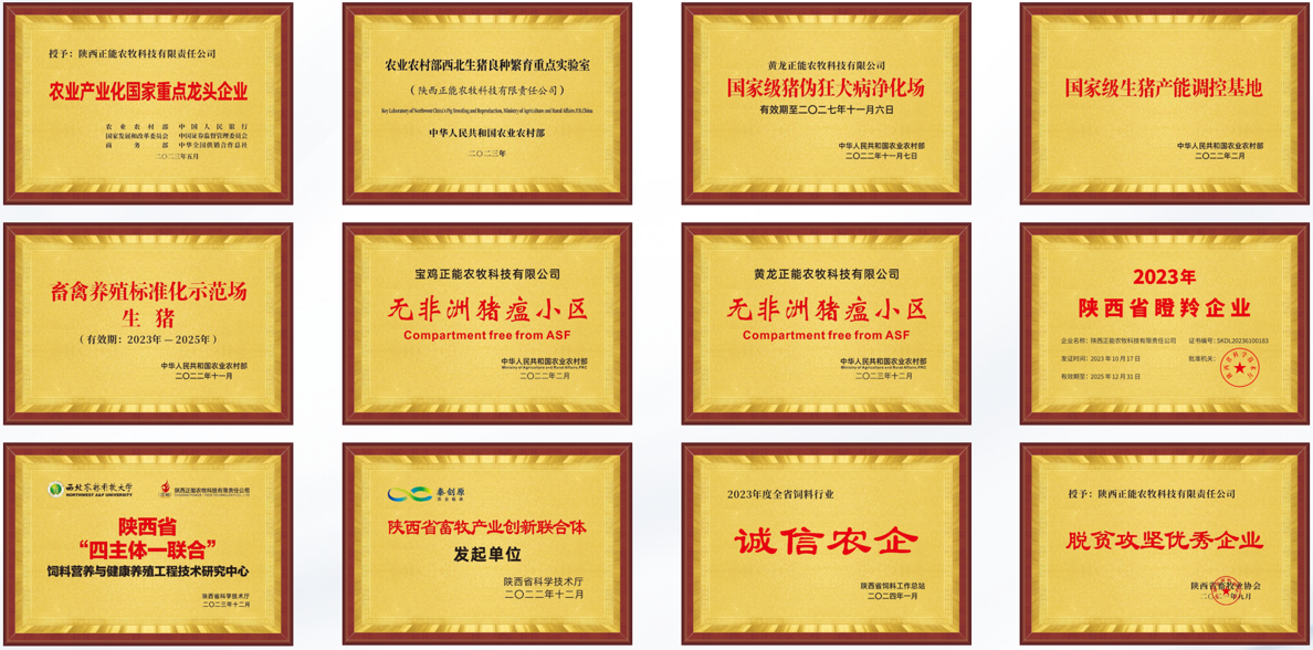 陜西正能農牧科技有限責任公司成立于2013年5月,注冊資本5000萬元。總部位于西安市高陵區涇河工業園,是以王義輝為代表的農業科技工作者共同創立的以“強農報國、富國興牧”為使命,以“創建中國一流農牧科技企業”為愿景的專業從事飼料和養豬的農業高科技企業,是國家農業產業化重點龍頭企業。 正能旗下擁有豬飼料和生豬養殖兩大產業,現有員工近1000人,產值30多億,有12家分子公司,經過十二年的發展公司目前總資產15億元。 飼料產業主營業務:圍繞豬飼料營養研發、生產、銷售、技術服務展開。在西安高陵、山西新絳、河南洛陽、甘肅等地擁有飼料生產和代加工基地。飼料年產能45萬噸,年銷售30萬噸。飼料業務覆蓋陜西、甘肅、山西、河南、寧夏、青海、重慶、四川、山東等地。豬料銷量在西北名列前茅,品牌影響力持續提升,正能豬飼料已成為西北養殖戶的首選。 養豬產業主營業務:圍繞種豬繁育、良種基因改良、生豬養殖展開。在咸陽禮泉、乾縣、寶雞麟游、延安黃龍、陜西銅川等地建有規模養殖場。母豬存欄2.7萬頭,年出欄生豬65萬頭,大力推廣“公司+基地+農戶的合作模式,業務范圍聚焦陜西,輻射西北地區。 公司成立以來,實行“科技創新、技術領先”的企業戰略,依托優秀的科技人才和集團強大的科研能力,與國內知名農業院校科研院所建立長期合作,注重科技研發,先后榮獲多項榮譽,農業產業化國家重點龍頭企業、農業農村部西北生豬良種繁育重點實驗室、農業農村部飼料質量安全管理規范示范企業、農業農村部“畜禽(生豬)養殖標準化范場”、農業農村部國家級“生豬產能調控基地”、農業農村部國家級“非洲豬瘟無疫小區”、農業農村部“國家級豬偽狂犬病凈化場”、陜西省科技廳“陜西省四主體一聯合“ 飼料營養與健康養殖工程技術研究中心、陜西省瞪羚企業、陜西民營50強企業等殊榮。